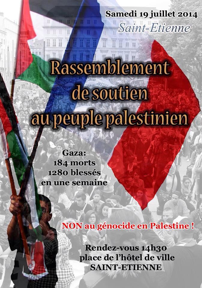 Après un premier rassemblement réussi à Saint-Étienne où plus de 2000 personnes étaient présentes pour protester contre les bombardements sur Gaza, une deuxième initiative citoyenne et pacifiste aura lieu le samedi 19 juillet à 14h30, Place de l’Hôtel de Ville.
